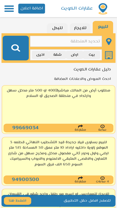 79%بيوت وفلل للبدل في الكويت اعلن او ابحث في مئات الـ بيوت وفلل المتاحة للبدل في الكويت من خلال موقع وتطبيق عقارات الكويت houses forexchange In Kuwait