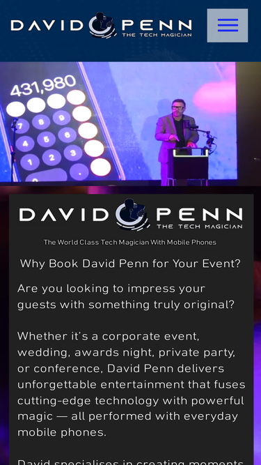 100%Discover David Penn, the leading tech magician specialising in mobile phone magic for corporate events, weddings, and private parties. Experience unforgettable digital illusions and interactive performances. Book now for top-tier entertainment!