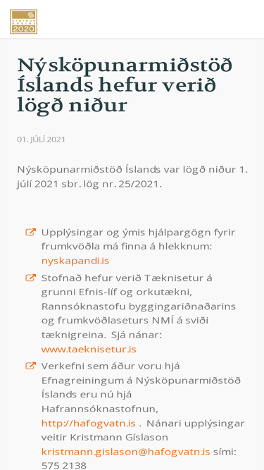 29%Nýsköpunarmiðstöð Íslands hefur verið lögð niður frá og með 1. júlí 2021 sbr. lög nr. 25/2021. Smelltu til að sjá meira...