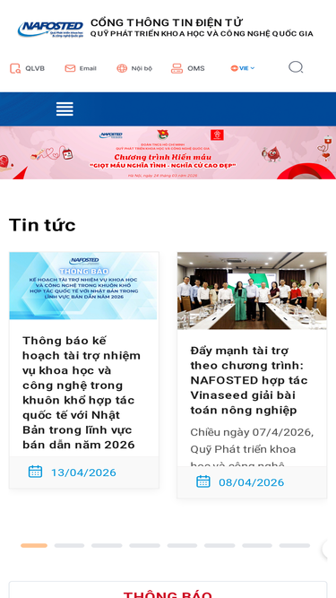 79%Tin tức Thông báo về việc tổ chức Hội thảo: “Quản lý rủi ro trong tài trợ, cấp kinh phí và thực hiện nghiên cứu khoa học và công nghệ” 20/11/2025 Thông báo Kết quả phê duyệt Danh mục đề tài Nghiên cứu cơ bản trong lĩnh vực Khoa học xã hội và Nghiên cứu ứng dụng do Quỹ Phát triển khoa học và công nghệ Quốc gia tài trợ thực hiện từ năm 2025 (tiếp nhận hồ sơ đợt 1 năm 2025) 20/11/2025 Thông báo Kết quả phê duyệt Danh mục đề tài nghiên cứu cơ bản trong lĩnh vực khoa học tự nhiên và kỹ thuật do Quỹ Phát triển KH&CN Quốc gia tài trợ thực hiện từ năm 2025 (tiếp nhận hồ sơ đợt 1 năm 2025) 16/11/2025 THÔNG BÁO: Nội dung ôn tập xét tuyển viên chức năm 2025 06/11/2025 THÔNG BÁO: Danh sách thí sinh đủ điều kiện và không đủ điều kiện dự tuyển vòng 2; danh sách thí sinh tham gia sát hạch để đánh giá năng lực; hình thức; thời gian nộp lệ phí dự tuyển của Quỹ Phát triển khoa học và công nghệ Quốc gia 06/11/2025 Kết quả nổi bật Sự kiện Công bố Quyết định bổ nhiệm và điều động Lãnh đạo cấp phòng trực thuộc Quỹ NAFOSTED 01/12/2025 Khai trương Hệ thống quản lý trực tuyến các nhiệm vụ KH&CN theo thời gian thực 27/11/2025 Quản lý rủi ro trong KH&CN: Kiến tạo hành lang đổi mới sáng tạo, bảo đảm hiệu quả đầu tư công 26/11/2025 Thông báo Kết quả phê duyệt Danh mục đề tài nghiên cứu cơ bản trong lĩnh vực khoa học tự nhiên và kỹ thuật do Quỹ Phát triển KH&CN Quốc gia tài trợ thực hiện từ năm 2025 (tiếp nhận hồ sơ đợt 1 năm 2025) 16/11/2025 Thông tin kết quả thực hiện nhiệm vụ Đột phá công nghệ giao diện não-máy tính: Cơ sở dữ liệu điện não đầu tiên của Việt Nam và ứng dụng hỗ trợ người bệnh đột quỵ Đề tài cấp nhà nước do PGS.TS. Phạm Ngọc Hùng (Trường Đại học Công nghệ, ĐHQGHN) chủ trì đã tạo ra bước tiến quan trọng trong lĩnh vực công nghệ y sinh, mở ra triển vọng mới cho việc điều khiển thiết bị bằng sóng điện não qua cơ chế 08 Tháng 10 2025 Xem chi tiết Thông tin kết quả thực hiện nhiệm vụ mã số NĐT/CZ/22/04 Tên nhiệm vụ “Nghiên cứu phát triển sản phẩm pho-mát tươi có lợi cho sức khỏe thíc