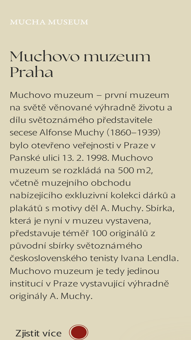 95%Jediné muzeum v Praze vystavující výhradně originály A. Muchy. Otevřeno 1998 v ulici Panská 7, Praha 1