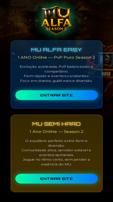 86%Servidor MU Online Clássico com modos Hard, Easy e Semi-Hard. Season 2 — PvP, eventos e diversão garantida!