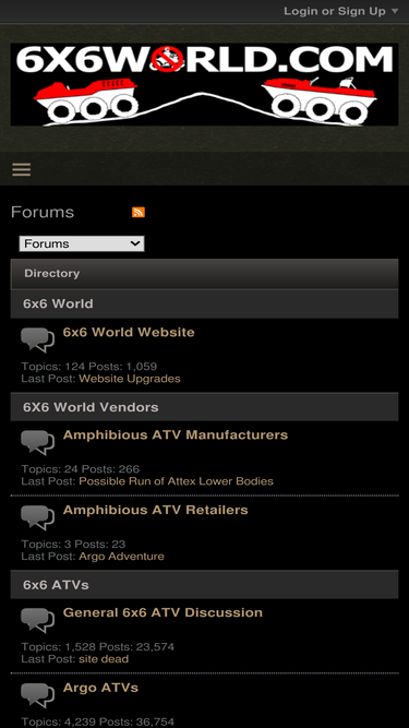 100%welcome to 6x6 world, the premiere website for amphibious atvs. come join our family friendly forums, browse the member submitted photo gallery, thumb through brochures, and check out the how-to section. argo, max, attex, hustler, terra tiger, mudd ox, and more 6x6 and 8x8 amphibious atvs are inside!