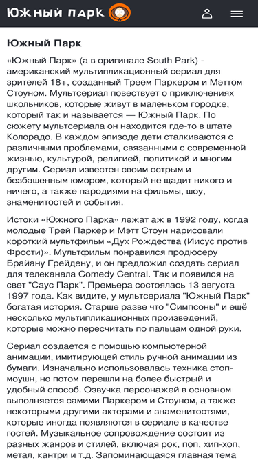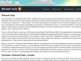 59%Один из лучших фан-сайтов по мультсериалу «Южный Парк». Здесь вы можете смотреть все сезоны «Южного Парка» бесплатно в хорошем качестве онлайн.