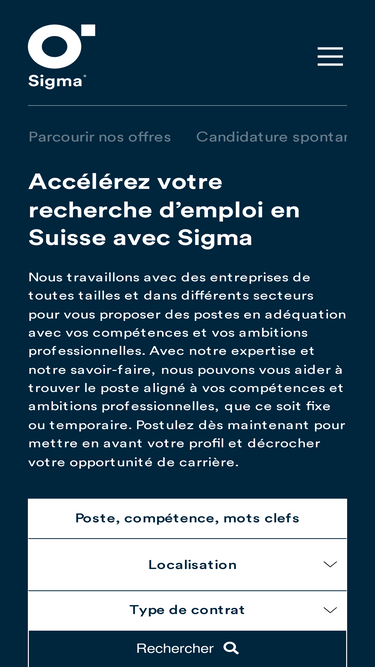 87%Envoyez votre candidature spontanée à Sigma et rejoignez une équipe passionnée par le recrutement et l'humain. Nous attendons votre profil avec impatience.