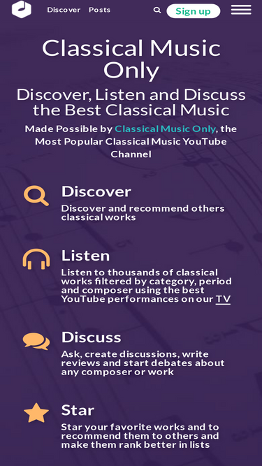 88%discover the greatest classical music. listen to top classical music composers and works. a free classical music website that lets you discover based on your taste by style, composer and genre. create classical music lists. ask for classical music recommendations. discover classical music anniversaries. review classical music.