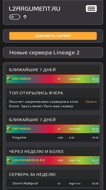 100%новые сервера lineage 2 - это анонсы серверов л2, а так же рейтинг серверов л2, собранные в список, с возможностью сортировки по рейтам и дате открытия новых серверов lineage