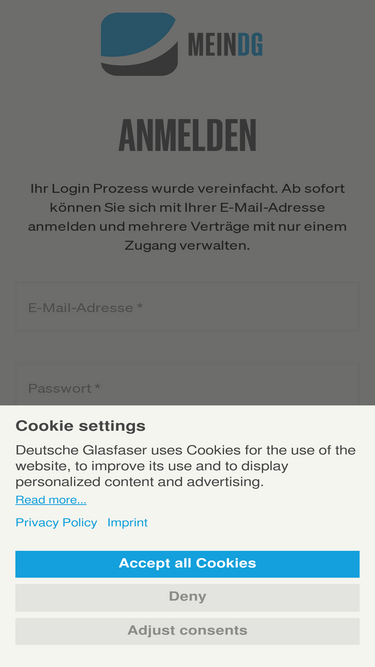 92%Melden Sie sich bei Mein DG an - Ihrem Kundenportal von Deutsche Glasfaser zur Verwaltung Ihrer Internet-, Telefon- und TV-Dienste.