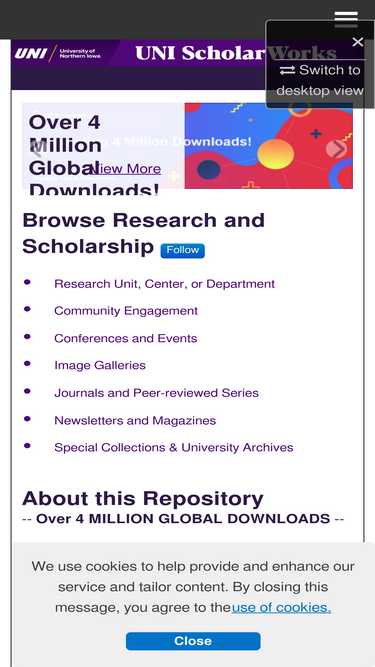 94%uni scholarworks collects, preserves and makes available the digital research and creative and scholarly output from the university of northern iowa (uni) community. our goal is to showcase the knowledge, creativity and innovative spirit of uni.