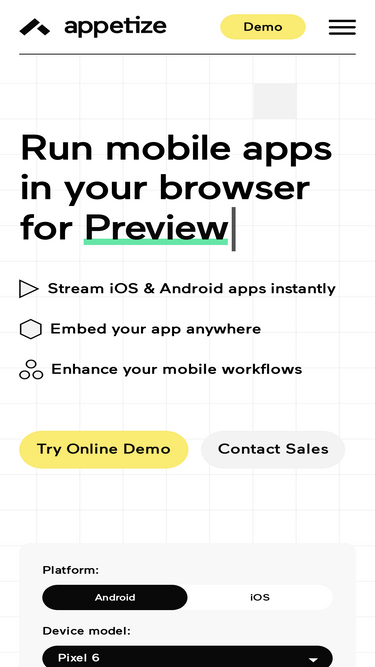Sign in to your Appetize.io account to update app settings, upload new builds, setup billing, and more.