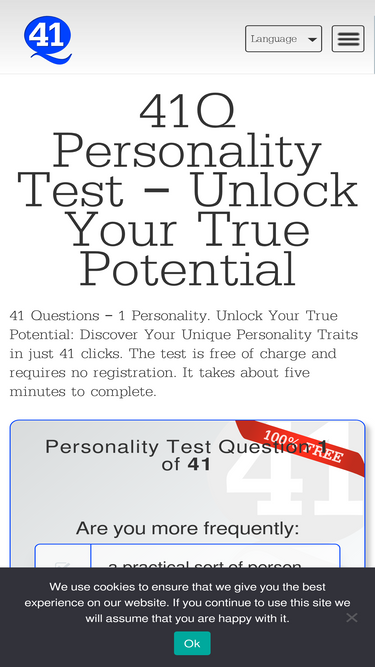 87%Free Personality Test. Your profile in 41 Questions. Share and compare your profile with friends and family.
