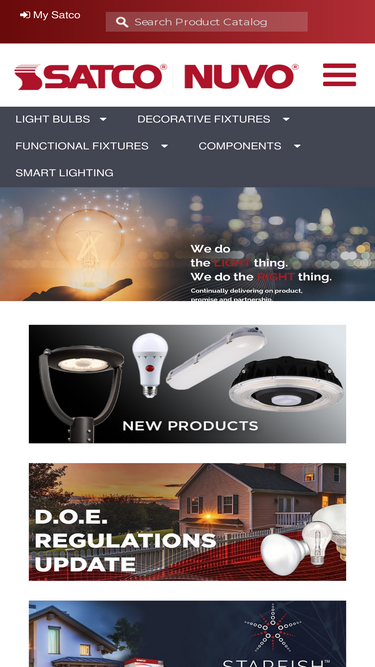 Landing page for Satco|Nuvo commercial fixtures containing High Bay Fixtures, Troffers, Flat Panels, Wall Packs, Area Site Lighting, and Downlights