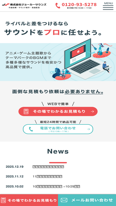 92%格安にて高品質な歌もの曲・BGM・インスト・効果音・作詞・編曲制作依頼を承っています。その場で価格がわかる自動見積もり可能です。メール、お電話は全て専門のスタッフが対応させていただきますので、お気軽にお問い合わせ下さい。