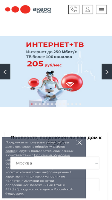 Официальный сайт телекоммуникационного провайдера АКАДО. Услуги установки и подключения Интернета по адресу, цифрового телевидения и IP телефонии в Москве. Гибкие тарифы. Круглосуточная техническая поддержка.