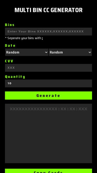 82%best cc generator for multiple bins, generates multiple bins at once, generate random test credit card numbers for testing, development,validation and/or verification purposes.