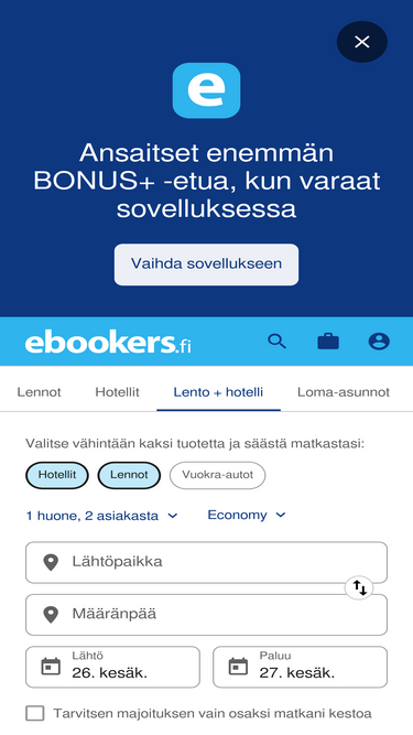 83%ebookersilla saat ENEMMÄN irti lomastasi. Vertaile halpoja lentoja, hotelleja, matkoja sekä vuokra-autoja ja kerää bonuksia. ✔ Parhaan hinnan takuu!