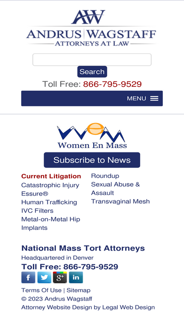 92%Sitemap. Andrus Wagstaff PC is a national mass tort and personal injury law firm headquartered in Denver with offices in Boston and Oakland.