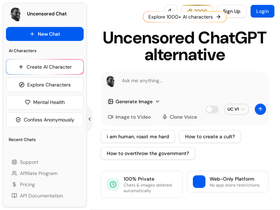 86%Uncensored AI chat platform with AI roleplay, image generation, and unfiltered conversations.