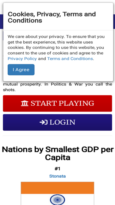 Politics & War is a free to play browser based political simulation game where you create your own nation and rule it. Forced to make difficult political decisions you are truly in charge in Politics & War. Play together with friends and strangers, pit your armies against each other and wage war, or work together cooperatively for mutual prosperity. In Politics & War you call the shots.