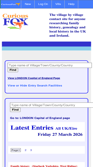 81%Find other people looking for the same family history in any county, town or village in the UK and Ireland. �Search by surname and/or location. See nearby villages, see nearby entries...