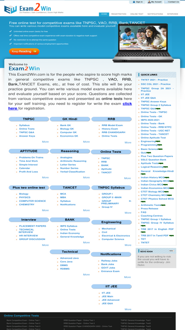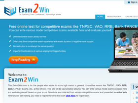 55%exam2win.com- free online test will help to score high marks in general competitive exams and entrance exams like tnpsc vao, rrb, bank exams,tancet,ibps exams etc., you can write various model exams available here at free of cost and evaluate yourself based on your score.