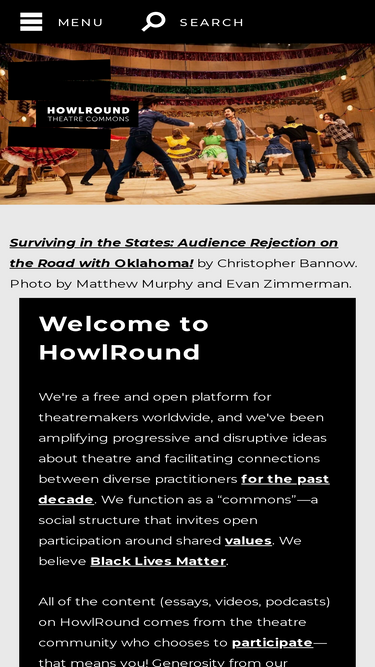 95%We’re a free and open platform for theatremakers worldwide. We amplify progressive, disruptive ideas about theatre and facilitate connection between diverse practitioners. We function as a “commons”—a social structure that invites open participation around shared values. All of the content (essays, videos, podcasts) on HowlRound comes from the theatre community who chooses to participate—that means you!
