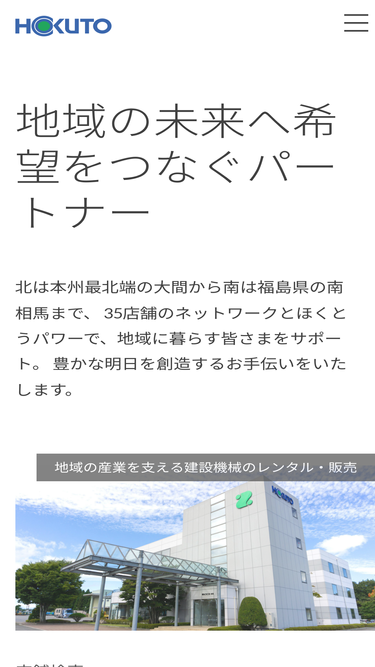 71%株式会社ほくとうは地域の産業を支える建設機械のレンタル・販売を行っております。本社を青森県八戸市に構え、北は本州最北端の大間から南は福島県の南相馬まで、35店舗のネットワークとほくとうパワーで、お客様を協力にバックアップしております。