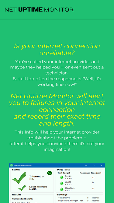 68%Net Uptime Monitor is a simple internet connection monitor that alerts you to connection failures and records their exact time and length