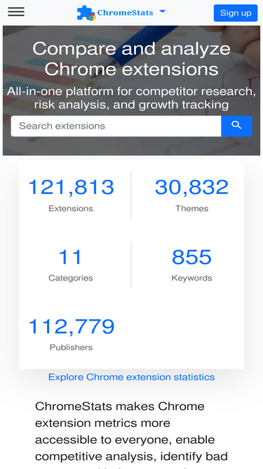 92%All-in-one platform to grow your Chrome extensions, Android apps, and other other add-ons. Download current and past extensions, access historical stats, and run competitive analysis for extensions and apps.