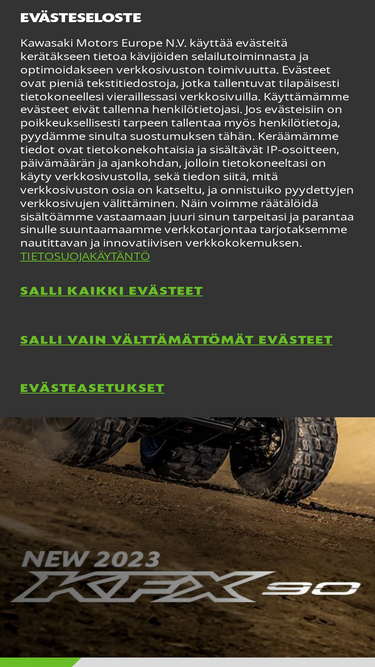 89%Tiimin tavoitteena on rakentaa vahva polku kohti tulevaisuuden menestystä – niin radalla kuin sen ulkopuolella. “Valmennamme junioreista ja heidän tukijoukoistaan valmiimpia ja kypsempiä urheilijoita – evästämme heidät paremmin tulevaisuuden polulle, niin radalla kuin sen ulkopuolella.” Kuljettajille tarjotaan kattava tuki kehitykseen ja kilpailemiseen: Uuden KX85-pyörän hankinnan yhteydessä perhe saa 500 € varaosapaketin, 200 € vaatepaketin ja 100 € huoltomaton. Tiimikuljettajille tallipaikka ja Kawasaki Race Service -varaosatuki kilpailuissa: nopea varaosasaatavuus ja erikoishinnoittelu. Team Green Asennepalkinto jaetaan jokaisessa SM-osakilpailussa kuljettajalle, joka osoittaa vahvaa asennetta ja tiimihenkeä (100 € lahjakortti). Lisäksi osakilpailuvoittajille 300 € lahjakorttipalkinto jonka voit hyödyntää vaikka varaosiin tai ajovarusteisiin. Osa kuljettajista saa mahdollisuuden edetä The North MX Alliance -kehitystiimiin, jossa valmennus viedään vielä syvemmälle: henkinen ja fyysinen valmennus, iskunvaimennusosaaminen, leirit sekä henkilökohtainen tukiverkosto auttavat kuljettajaa kehittymään seuraavalle tasolle. Haku on avoinna 1.11.2025 saakka, ja lisätiedot sekä hakulomake löytyvät osoitteesta www.sumeko.fi/kawasaki-sumeko-team-haku