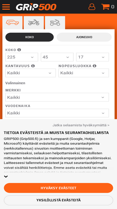89%grip500:lta löytyy suuri valikoima kesärenkaita, ympärivuorokautisia renkaita ja talvirenkaita alennettuun hintaan kaikille ajoneuvoille: auto, maastoauto, neliveto, moottoripyörä jne. ilmainen toimitus.