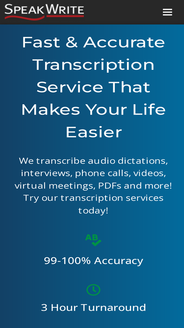 87%Complete flexibility in how you send and receive your transcriptions. See more about how SpeakWrite's Transcription Services work.