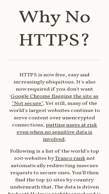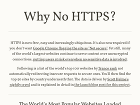 With the web rapidly becoming secure by default, "Why No HTTPS?" is a who's who of the world's biggest websites globally and by country still not defaulting to HTTPS.