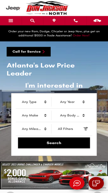 largest jeep inventory in north georgia! | located in cumming, georgia, don jackson's family owned dealership has been serving the atlanta area for over 50 years. we carry the latest chrysler, dodge, jeep, ram vehicles, quality used cars and have a full-service auto repair department. shop online or visit our chrysler, dodge, jeep ram dealership from union city, alpharetta, gainesville or roswell, ga.