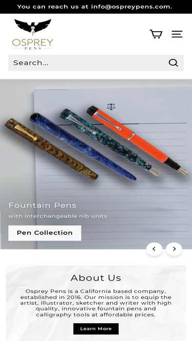 93%Osprey Pens, the best calligraphy fountain pen manufacturer in California having wide variety of fountain pen collection - Scholar, Milano and Dip Pens that are unique and available in vibrant acrylic colors. Osprey Pens idea of giving back is we donate a predetermined amount of the product sale to charities.