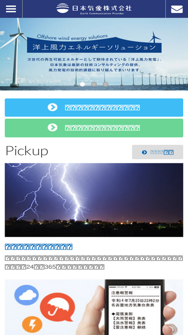 78%日本気象は、気象予測、大気環境調査、シミュレーションなど様々な技術をもって、全国に幅広く活動を行っています。人々のかけがえのない命と大切な財産の保全、自然エネルギー活用型社会の推進をはじめ、地球環境や社会の安全・安心に貢献してまいります。