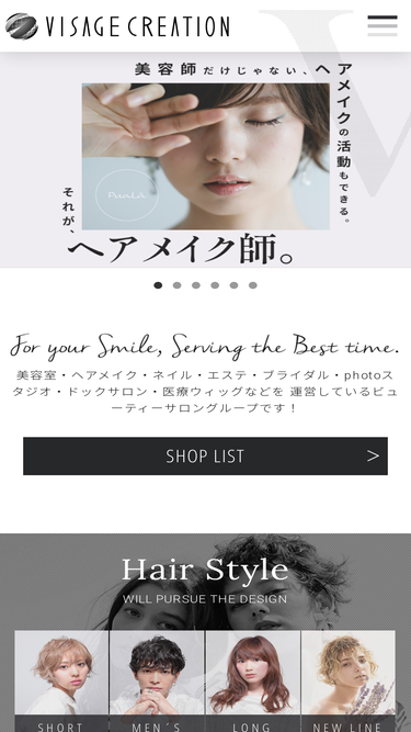 85%銀座,青山,市川を拠点にヘアサロン・出張ヘアメイク・ネイル・エステ・ブライダル・photoスタジオ・ドックサロン・医療ウィッグなどを運営しているビューティーサロングループVISAGE CREATION(ヴィサージュクリエイション)のホームページです。