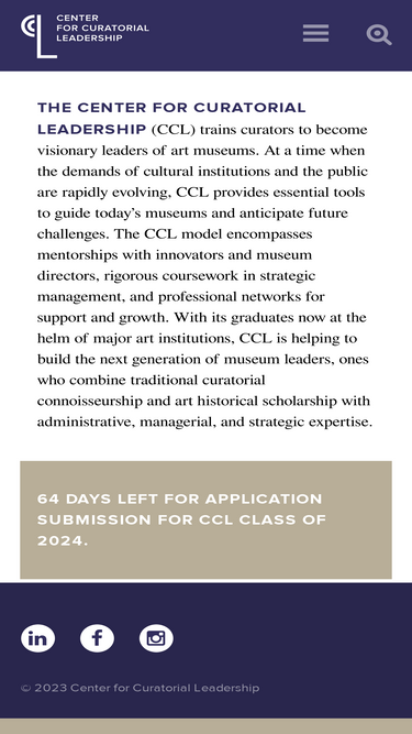 100%Twelve Curators Announced for Sixteenth Annual Intensive Training Program The Center for Curatorial Leadership (CCL) is excited to introduce its 2023 cohort of Fellows. Now in its sixteenth year, the CCL Fellowship is the preeminent leadership program for curators, providing them the skills and tools needed to become visionary leaders of art museums. The twelve curators selected for the highly competitive program each have an established record of scholarly and curatorial excellence and a shared commitment to creating a more equitable and inclusive museum field. The 2023 cohort reflects the diversity of curatorial practice today, representing a range of institutional contexts from throughout the Americas and with expertise spanning thousands of years of artistic creativity across the globe. CCL’s Fellowship program prepares curators to influence, evolve, and shape the future of museums. Remaining responsive to the changing museum landscape, the curriculum emphasizes innovative and cross-disciplinary approaches to leadership and centers…