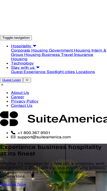 90%suite america provides platinum-level service in corporate housing, short term apartments and gsa contract housing. at suiteamerica 800-367-9501, we’re using game-changing technology, 24/7 service and our nearly 30 years of excellence in customer service to revolutionize the corporate housing experience around the globe.
