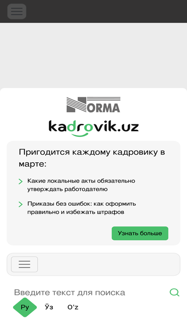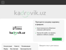 79%Инструкции по кадровому делопроизводству в Узбекистане. Ищете, где можно получить консультацию по кадровому учету от специалистов? На портале Kadry.Uz Вы найдете самые полные и подробные инструкции, рекомендации, статьи, новости, документацию, законодательные акты и другую необходимую информацию в сфере трудового права и HR-делопроизводства.