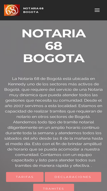 85%la notaría 68 de bogotá está ubicada en kennedy uno de los sectores más activos de bogotá, que requiere del servicio de una notaria muy dinámica que pueda atender todos las gestiones que necesita su comunidad. desde el año 2007 servimos a esta localidad. estamos en capacidad de realizar tramites que requieran de notario en otros sectores de bogotá.