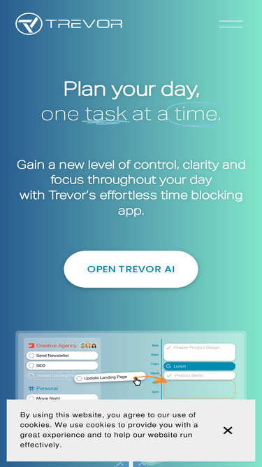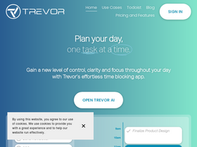 100%Trevor AI is the most intuitive daily planner & task scheduling app. Trusted by thousands of ambitious humans to schedule their daily tasks with Trevor's AI time blocking technology. Regain control, clarity and focus throughout your day, by signing up, today!