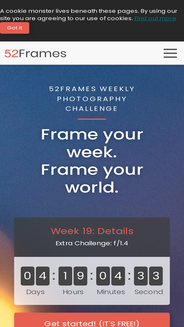 85%unleash your creativity, one week at a time. 52frames is a worldwide community of photography enthusiasts from all walks of life (ranging from novices to experts). together we strive to improve as photographers by participating in weekly photo challenges.
