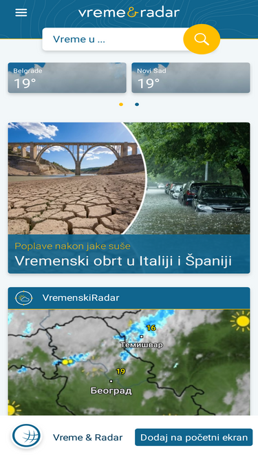 Trenutno vreme, prognoza vremena za vašu lokaciju - sa vremenskim izveštajem, trendom vremena, radarom za padavine i još mnogo toga u Vreme & Radar
