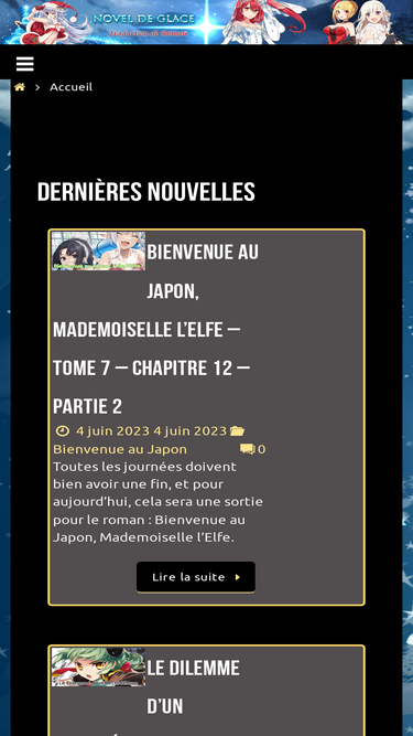 68%Dernières nouvelles Projets Les dernières sorties Les prochaines sorties Tempête de neige en cours... Rythme de sorties (mise à jour : 02/01/2020) (plus d'info ici) Lundi : 1 chapitre de Wortenia Senki 1 chapitre par deux semaines de Pensiez-vous qu'un autre monde motiverait un NEET? 1 chapitre par deux semaines de Izure Shinwa no Ragnarok 1 chapitre de Il ne voulait pas être le Centre de l'Attention LN 1 chapitre de La Fierté d'Assassin 1 chapitre de Le Maître de Ragnarok et la Bénédiction d'Einherjar 1 chapitre de Ecstas Online (si disponible) 1 chapitre de Le Monde dans un Jeu Vidéo Otome est difficile pour la Populace Mardi : 1 chapitre par 2 semaines de Ma maison est un point de concentration de magie 1 chapitre par 2 semaines de Protection Divine de Nombreux Dieux 1 chapitre de J’ai été réincarné en une Académie de Magie ! 1 chapitre de Rakudai Kishi no Cavalry 1 chapitre de Béni par la Déesse et Transféré dans un Autre Monde ! 1 chapitre de Divas de la Bataille 1 chapitre de Womanizing Mage 1 chapitre de Le Dilemme d'un Archidémon Mercredi : 1 chapitre de Vivre dans ce monde avec la compétence Couper & Coller 1 chapitre de… Lire la suite