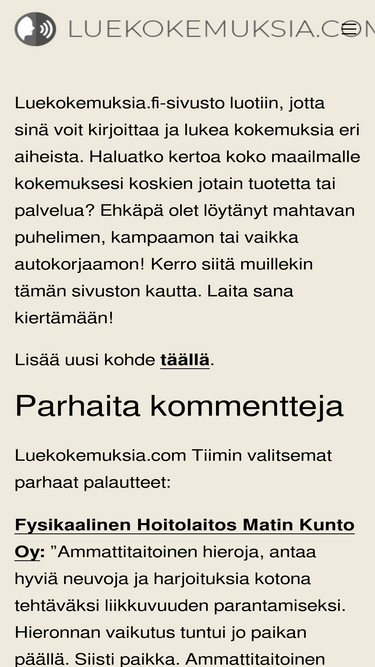 100%Luekokemuksia.fi-sivusto luotiin, jotta sinä voit kirjoittaa ja lukea kokemuksia eri aiheista. Haluatko kertoa koko maailmalle kokemuksesi koskien jotain tuotetta tai palvelua? Ehkäpä olet löytänyt mahtavan puhelimen, kampaamon tai vaikka autokorjaamon! Kerro siitä muillekin tämän sivuston kautta. Laita sana kiertämään! Lisää uusi kohde täällä. Parhaita kommentteja Luekokemuksia.com Tiimin valitsemat parhaat palautteet: Fysikaalinen Hoitolaitos Matin Kunto Oy:… Jatka lukemista Lue kokemuksia