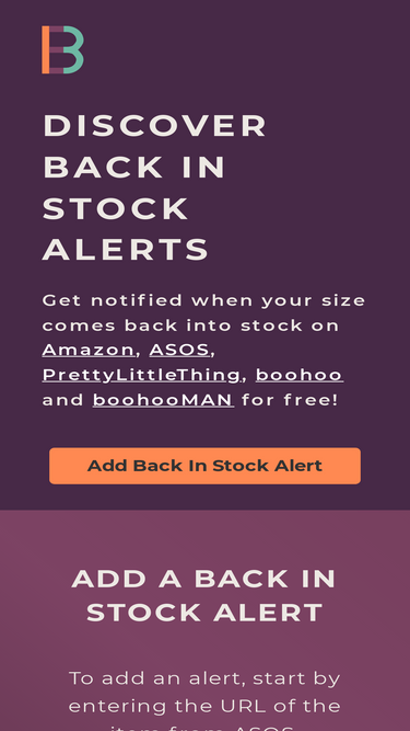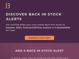 90%get back in stock alerts for top retailers. we will alert you when your amazon, asos, prettylittlething, boohoo or boohooman product comes back into stock in your size.