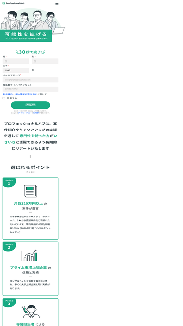 87%無料登録ページです。プロフェッショナルハブは、業界No1のエルティーエスリンクが提供するプロフェッショナル人材サービスです。 プロフェッショナルの可能性・能力を見極め、そのパフォーマンスを最大限に発揮できるよう、プロフェッショナルとクライアントに伴走するために活動しています。