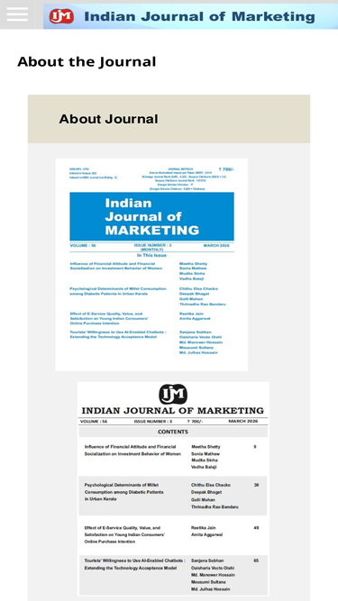 53%associated management consultants pvt. ltd. is running five very successful double blind peer reviewed refereed management research journals, mr. j.c. gilani was an alumnus of faculty of management studies, university of delhi and was the founder of associated management consultants pvt. ltd. editorial board of indian journal of marketing, archive of indian journal of marketing. digital papers of past issues are available for purchase in the archives, author index of indian journal of marketing helps you find papers written by an author, indian journal of marketing is in indexed in scopus, index copernicus, google scholar, niscair, naas, ulrich's international periodicals directory, eisrjc, academic keys, cabell's directory of publishing opportunities, indian journal of marketing is in indexed in scopus, index copernicus, google scholar, niscair, naas, ulrich's international periodicals directory, eisrjc, academic keys, cabell's directory of publishing opportunities, current issue of indian journal of marketing, search papers of indian journal of marketing using various parameters and keywords, register user with indian journal of marketing, table of contents of indian journal of marketing, cover page of indian journal of marketing, article status of indian journal of marketing, submit an article/research paper online for indian journal of marketing, request a sample copy for indian journal of marketing, indian journal of marketing is a leading marketing journal that enjoys wide readership of researchers, academicians, scholars and professionals.it is a research publication dealing with marketing, advertising, consumer behaviour, submit a query or give your feedback, from the editor's desk, contact information for indian journal of marketing, advertise with indian journal of marketing, forthcoming issues of indian journal of marketing, subscribe to or renew subscription for indian journal of marketing, request missing issues of indian journal of marketing, request