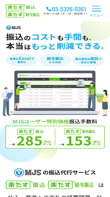 100%ミロク情報サービス(MJS)がご提供する「楽たす振込」は、中小企業の仕入、経費などの振込支払業務をMJSが代行することにより、振込手数料の削減と業務効率化を支援するクラウドサービスです。